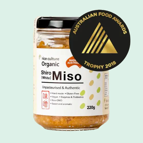 Shiro (White) Miso is light coloured soybean miso made with higher ratio of Koji and reduced salt in a short fermentation period. Enjoy the beautiful sweet and aromatic flavour. Made from Australian-grown GMO-free certified organic soybeans, natural sea salt and our own hand-made organic Koji, our unpasteurised Shiro (White) Miso is rich in enzymes, and probiotics. Trophy for Best Preserve / Best in Class Savoury Preserve / Gold Medal - 2018 Australian Food Awards Silver Medal - 2021 Sydney Royal Fine Food Show Silver Medal - 2019 Australian Food Awards Bronze Medal - 2022 Sydney Royal Fine Food Show Bronze Medal - 2022 Tasmanian Food Awards