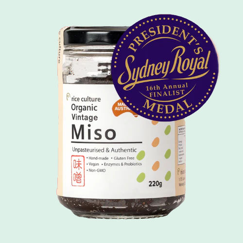 Vintage Miso is very dark, almost black, miso, fermented for more than 18 months. The browning process is known as the Maillard Reaction and the dark pigment produced not only adds rich umami (savoury) flavour but also is a powerful antioxidant. And the taste? Interestingly similar to Vegemite! Why not try on toast? Made from Australian-grown GMO-free certified organic soybeans, natural sea salt and our own hand-made organic Koji, our unpasteurised Vintage Miso is fermented for more than eighteen months, and is rich in enzymes, probiotics and antioxidants. President's Medal Finalist / Champion Spice, Pickled Product or Vinegar / Gold Medal - 2022 Sydney Royal Fine Food Show Champion Specialty Product / Gold Medal - 2021 Sydney Royal Fine Food Show Gold Medal - 2019 Australian Food Awards Silver Medal - 2022 Tasmanian Food Awards Bronze Medal Ð 2018 Australian Food Awards